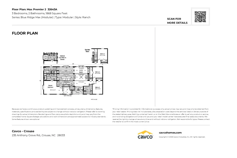 Our home building facilities invest in continuous product and process improvements. Plans, dimensions, features, materials, specifications, and availability are subject to change without notice or obligation. Renderings and floor plans are representative likenesses of our homes and many differ from actual homes. We invite you to tour a Home Center near you and inspect the highest value in quality housing available or call (828) 456-2822 to speak with a Home Consultant. ©2026, CMH. All rights reserved.